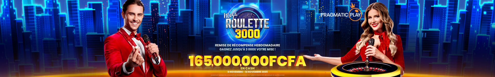• Le Mega Roulette 3000 Prize Drop se déroule du 6 novembre 2025 à 10h01 CET au 12 novembre 2025 à 23h59 CET (la « période promotionnelle »). Il s'agit d'une promotion réseau gérée par Pragmatic Play et les cagnottes sont partagées entre différents opérateurs.